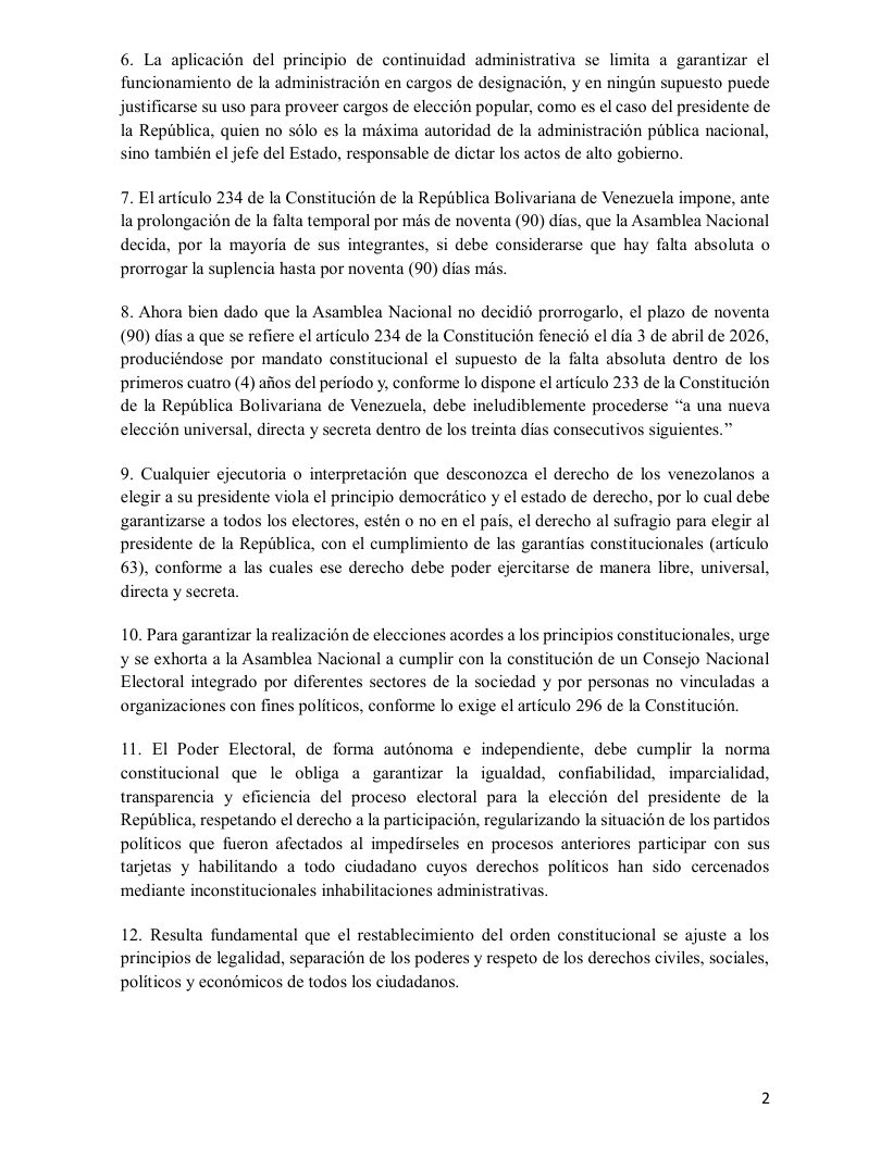 5. La prolongación indefinida del ejercicio del cargo de presidente de la República por una autoridad no electa es violatoria del principio democrático y de la legitimidad de origen del Poder Ejecutivo Nacional.