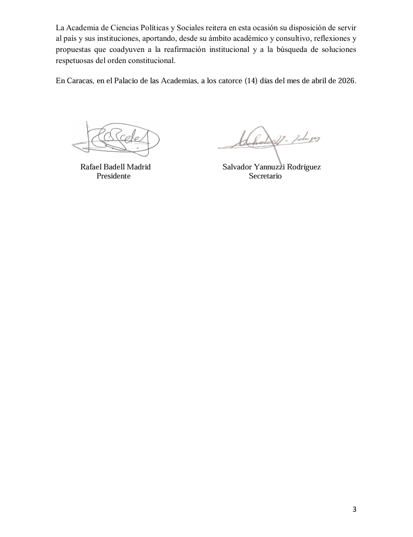 La Academia de Ciencias Políticas y Sociales reitera en esta ocasión su disposición de servir al país y sus instituciones, aportando, desde su ámbito académico y consultivo, reflexiones y propuestas que coadyuven a la reafirmación institucional y a la búsqueda de soluciones respetuosas del orden constitucional.
