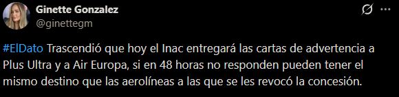 “Trascendió que hoy el Inac entregará las cartas de advertencia a Plus Ultra y a Air Europa; si en 48 horas no responden, podrían tener el mismo destino que las aerolíneas a las que se les revocó la concesión”, indicó González.