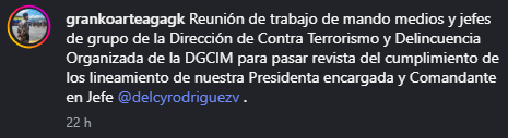 «Reunión de trabajo de mando medios y jefes de grupo de la Dirección de Contra Terrorismo y Delincuencia Organizada de la DGCIM para pasar revista del cumplimiento de los lineamientos de nuestra presidenta encargada y comandante en jefe, Delcy Rodríguez», anunció Granko en sus redes sociales, donde adjuntó una serie de imágenes de la cita.