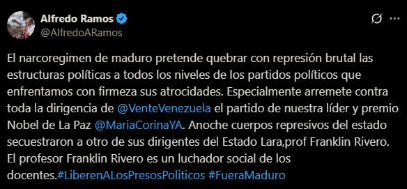 «El narcoregimen de maduro pretende quebrar con represión brutal las estructuras políticas a todos los niveles de los partidos políticos que enfrentamos con firmeza sus atrocidades. Especialmente arremete contra toda la dirigencia de Vente Venezuela, el partido de nuestra líder y premio Nobel de La Paz, María Corina Machado. Anoche cuerpos represivos del estado secuestraron a otro de sus dirigentes del Estado Lara, el profesor Franklin Rivero», denunció.
