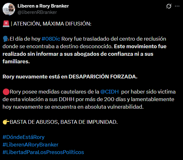 El mensaje difundido resalta que Branker posee medidas cautelares otorgadas por la Comisión Interamericana de Derechos Humanos (CIDH). Esta protección internacional le fue concedida tras haber sido víctima de violaciones a sus derechos humanos durante un periodo previo de aislamiento e incomunicación que se prolongó por más de 200 días.