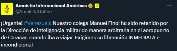 “Manuel Finol artista y activista de larga trayectoria, gerente de Amnistía Internacional Venezuela ha sido retenido en el aeropuerto de Maiquetía. ¡Manuel debe ser liberado ya!”, publicó la ONG a través de su cuenta en X.