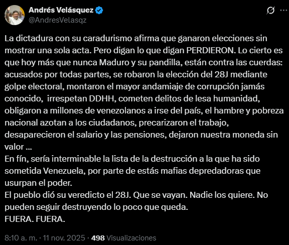 «La dictadura con su ‘caradurismo’ afirma que ganaron elecciones sin mostrar una sola acta. Pero, digan lo que digan, PERDIERON», enfatizó Velásquez en rede sociales.