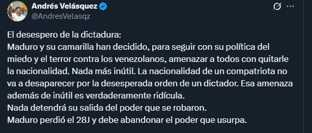 “Maduro y su camarilla han decidido, para seguir con su política del miedo y el terror contra los venezolanos, amenazar a todos con quitarle la nacionalidad. Nada más inútil. La nacionalidad de un compatriota no va a desaparecer por la desesperada orden de un dictador”, publicó el ex diputado a través de cuenta personal en X.