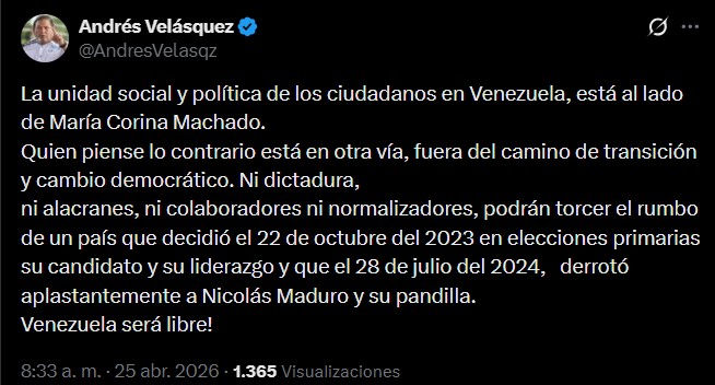 A través de su cuenta en X, Velásquez afirmó que quienes no reconocen ese liderazgo “están en otra vía”, al considerar que se apartan del camino hacia una transición y un cambio democrático en Venezuela.