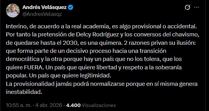 A través de su cuenta en X, Velásquez apeló incluso a la definición de la Real Academia Española para reforzar su planteamiento. “Interino, de acuerdo a la real academia, es algo provisional o accidental”, escribió.