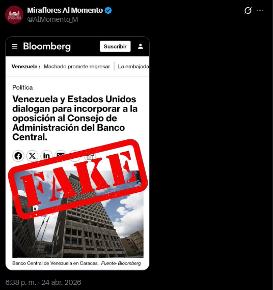 La cuenta oficialista en la red social X, conocida como Miraflores Al Momento, tachó de «fake» la investigación revelada por la agencia estadounidense Bloomberg. El texto periodístico detalló que el chavismo evaluaba ceder espacios dentro del ente emisor a figuras independientes para intentar lavar la imagen de la institución frente a la comunidad internacional tras años de opacidad institucional.