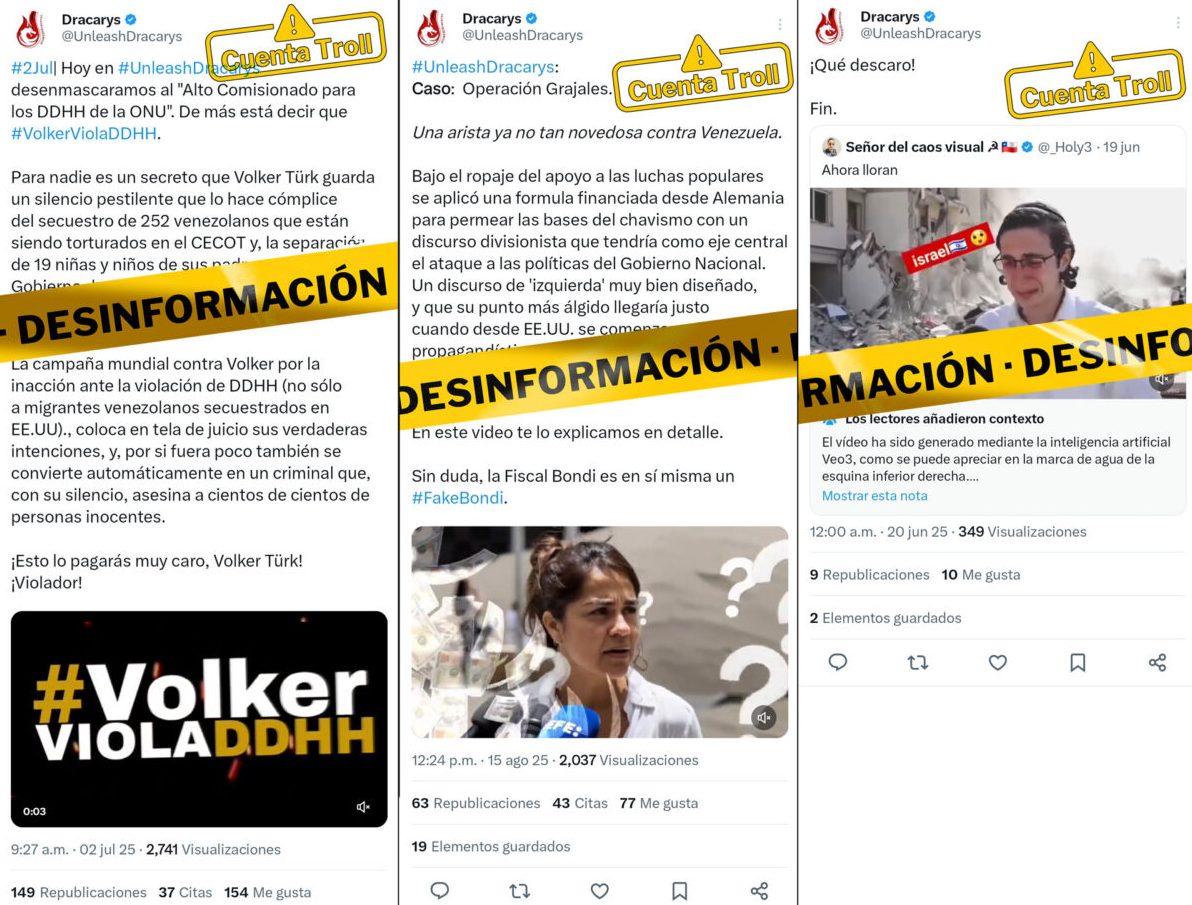 En sus publicaciones, Dracarys recurre a un tono altamente emocional y descalificador, con piezas audiovisuales que incorporan elementos generados o manipulados con IA y que, a veces, deshumanizan a adversarios del gobierno de Maduro. Su comunidad replica estas dinámicas: participa en etiquetas, y difunde textos, memes e imágenes con el logo del dragón y la etiqueta #UnleashDracarys.