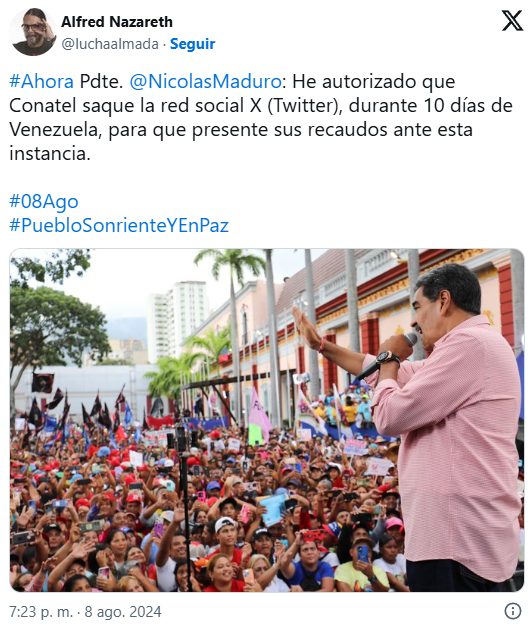 Muchas de las cuentas oficiales del gobierno de Nicolás Maduro dejaron de publicar contenidos en X alrededor del 9 de agosto de 2024, un día después de que se anunciara su bloqueo en Venezuela. Ese día, la cuenta del Mippci propuso la etiqueta #HastaProntoX, una especie de despedida “oficial” del ministerio de una red social que durante años había aprovechado para promover centenas de campañas coordinadas de propaganda digital.
