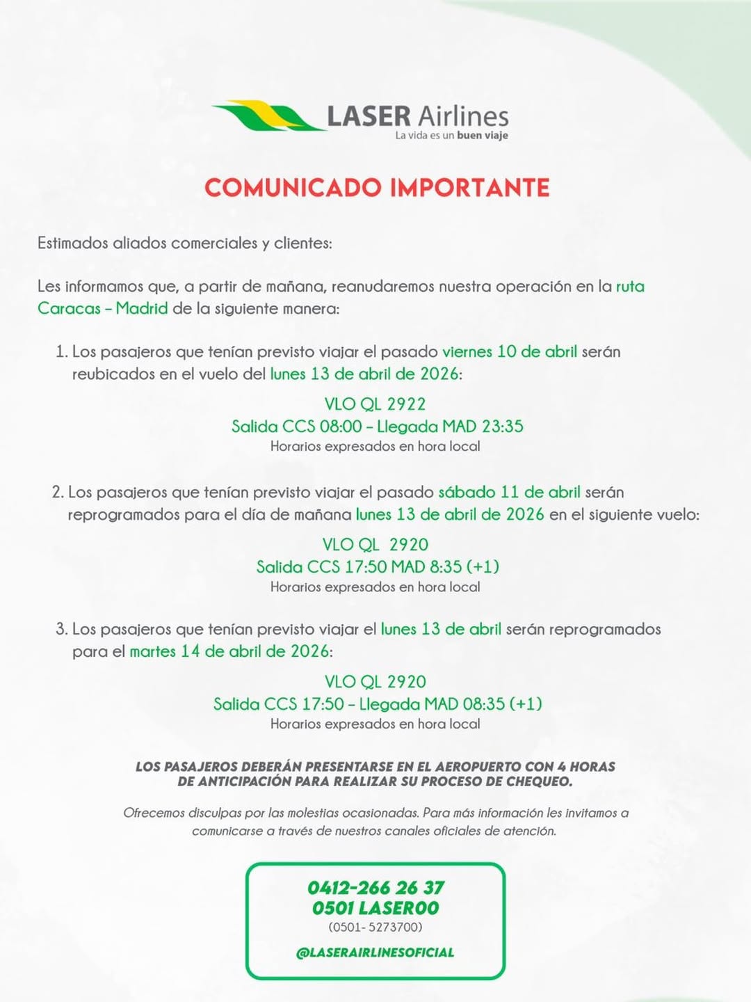 Laser Airlines ofreció disculpas por las molestias ocasionadas e invitó a los usuarios a comunicarse a través de sus canales oficiales para obtener mayor información.