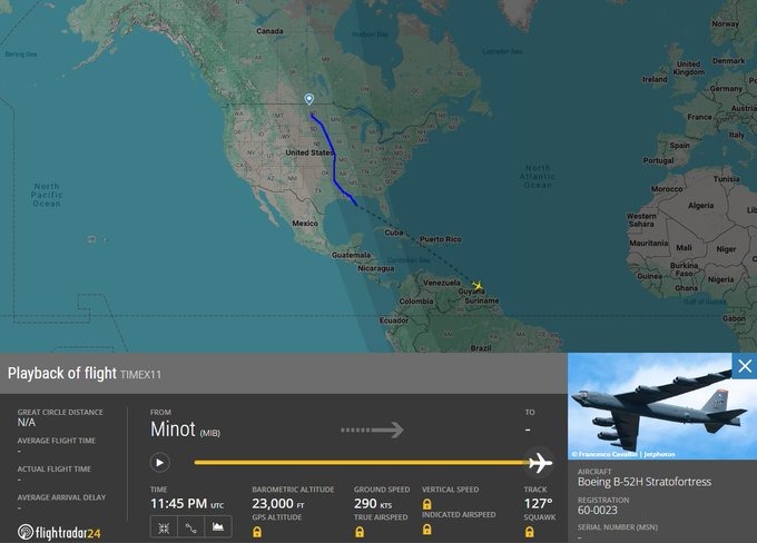 Un bombardero estratégico B-52H Stratofortress de la Fuerza Aérea de los Estados Unidos, identificado con la matrÃcula 60-0023 y el indicativo de radio TIMEX11, fue rastreado operando frente a la costa de Surinam, según el portal de monitoreo aéreo FlightRadar24.