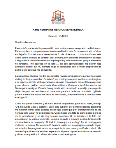 En el mismo sentido destacó que tenía compromisos eclesiales en Madrid y España hasta el 21 de diciembre, detalló que al llegar a Migración se encontró con la misma rutina de siempre: el oficial se llevó su pasaporte a consultar aduciendo que “el sistema no funciona” o que “no aparece en la lista.”