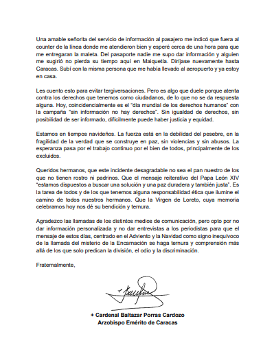 El Cardenal Baltazar Porras se pronunció tras nueva arremetida del régimen chavista ocurrida la mañana de este 10 de diciembre en el Aeropuerto Internacional de Maiquetía, donde le fue retenido su pasaporte y se le impidió abordar un vuelo con destino a España.