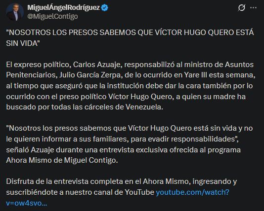 Durante una entrevista en el programa «Ahora Mismo», difundida en YouTube y replicada en X por el periodista Miguel Ángel Rodríguez, Azuaje afirmó que entre los propios reclusos existe la certeza de que Quero “está sin vida”, al tiempo que cuestionó el silencio de las autoridades en torno al caso.