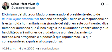El exgobernador del estado Táchira, César Pérez Vivas, criticó a Nicolás Maduro tras las recientes declaraciones proferidas por este último hacia el presidente electo de Chile, José Antonio Kast.