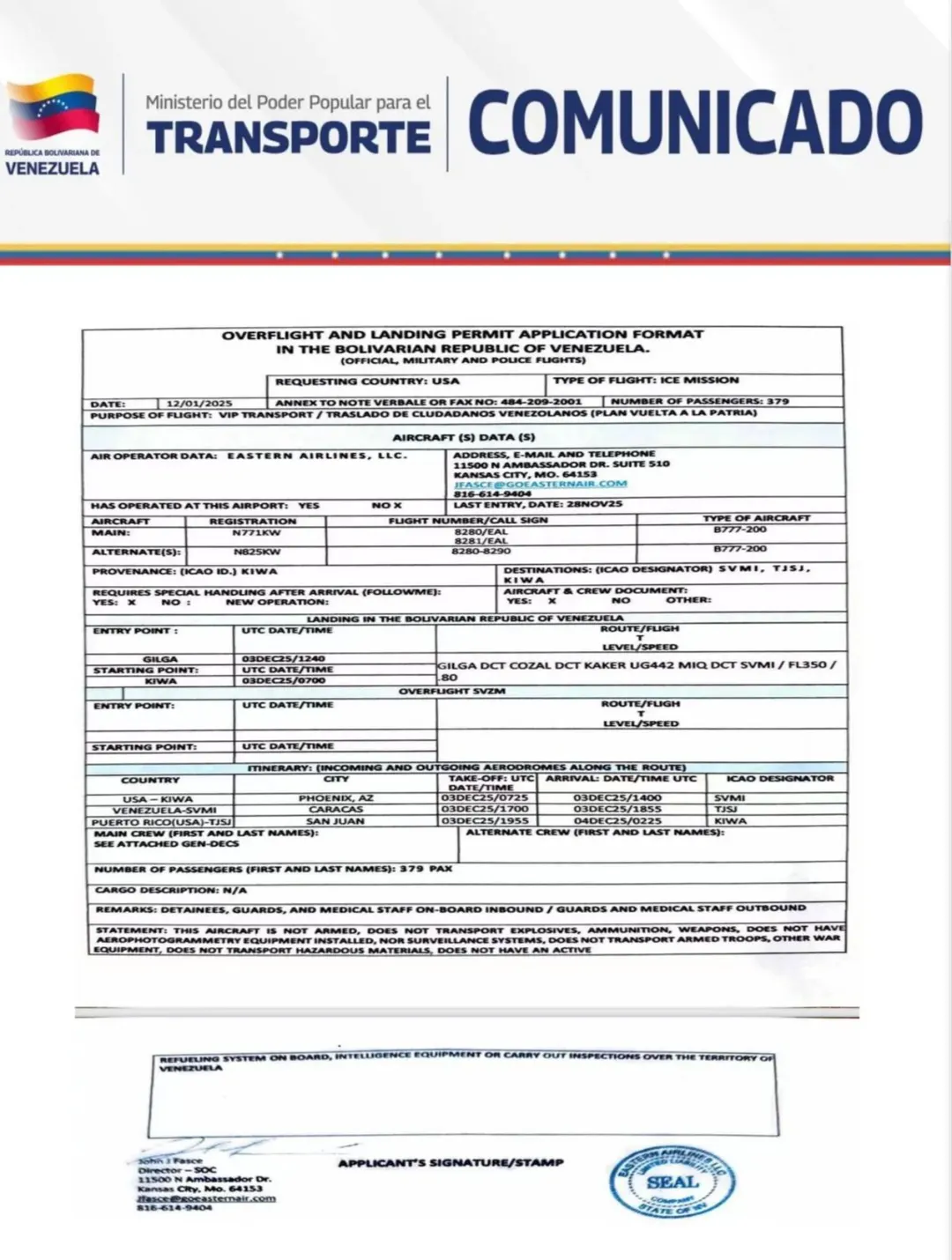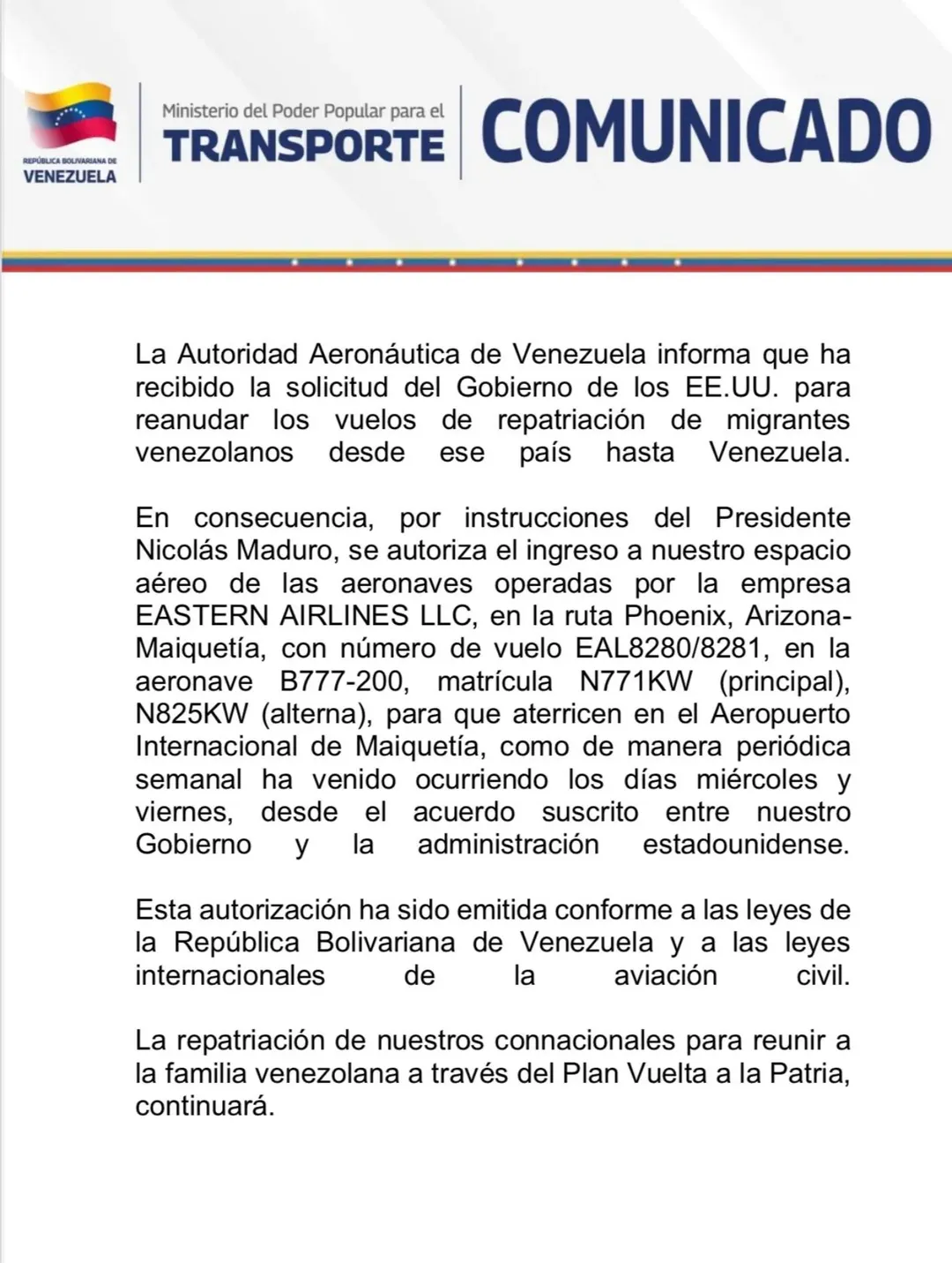 Según el comunicado oficial, las autoridades aeronáuticas aprobaron nuevamente el ingreso de las aeronaves B777-200, matrículas N771KW (principal) y N825KW (alterna), en la ruta Phoenix (Arizona) – Maiquetía, bajo los vuelos EAL8280/8281, tal como se ha venido realizando semanalmente los días miércoles y viernes desde el acuerdo de deportaciones firmado este año entre ambos gobiernos.
