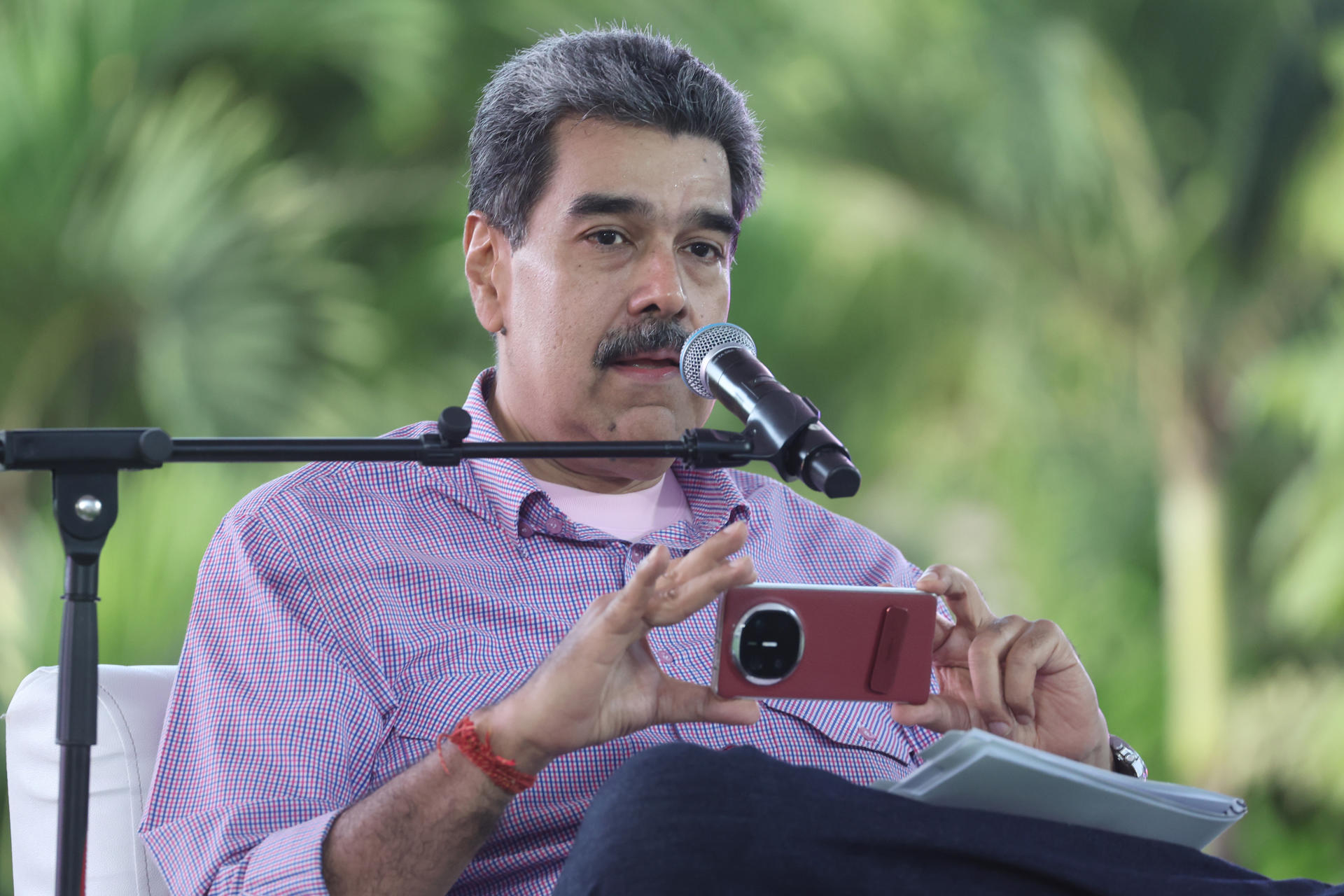 AME8769. CARACAS (VENEZUELA), 13/11/2025.- El presidente de Venezuela, Nicolás Maduro, sostiene un teléfono durante la Gran Marcha de la juventud comunera este jueves, en Caracas (Venezuela). EFE/ Miguel Gutierrez