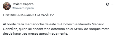 El alcalde Oropeza escribió en X: «LIBERAN A MACARIO GONZÁLEZ. Al borde de la medianoche de este miércoles fue liberado Macario González, quien se encontraba detenido en el SEBIN de Barquisimeto desde hace tres meses aproximadamente.»