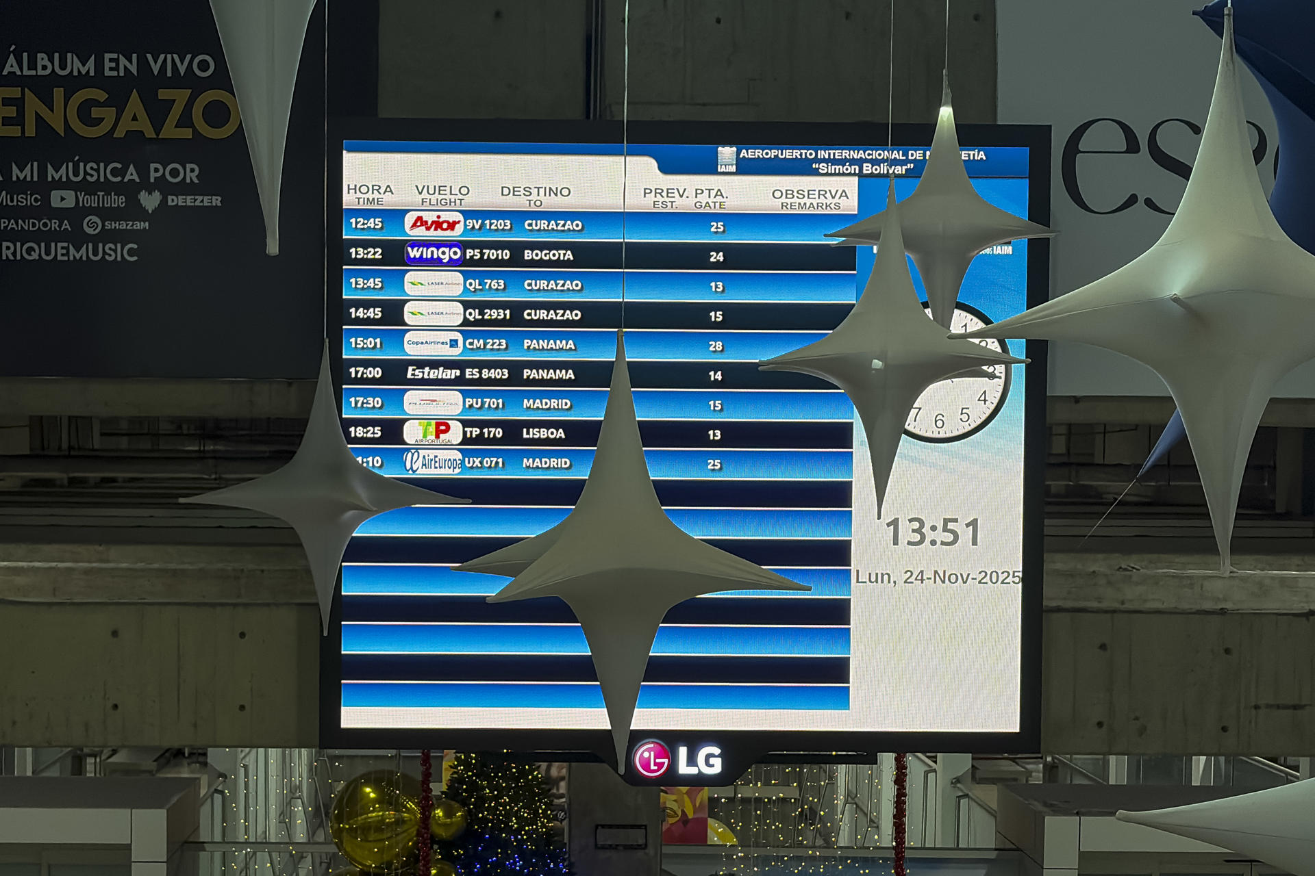 AME2256. MAIQUETÍA (VENEZUELA), 24/11/2025.- Fotografía de una pantalla con información de vuelos este lunes, en el aeropuerto internacional Simón Bolívar, que sirve a Caracas, en Maiquetía (Venezuela). Varias aerolíneas internacionales han suspendido sus vuelos hacia Venezuela, en respuesta a la alerta emitida por EE.UU. para "extremar la precaución" al sobrevolar ese país, eleva la tensión en la región. EFE/ Miguel Gutiérrez
