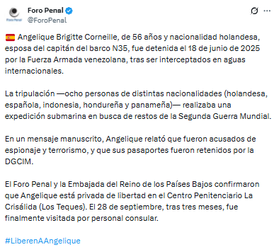 La ONG Foro Penal denunció la detención de la ciudadana holandesa Angelique Brigitte Corneille, de 56 años, y el resto de la tripulación de un barco que realizaba una expedición submarina con fines históricos.