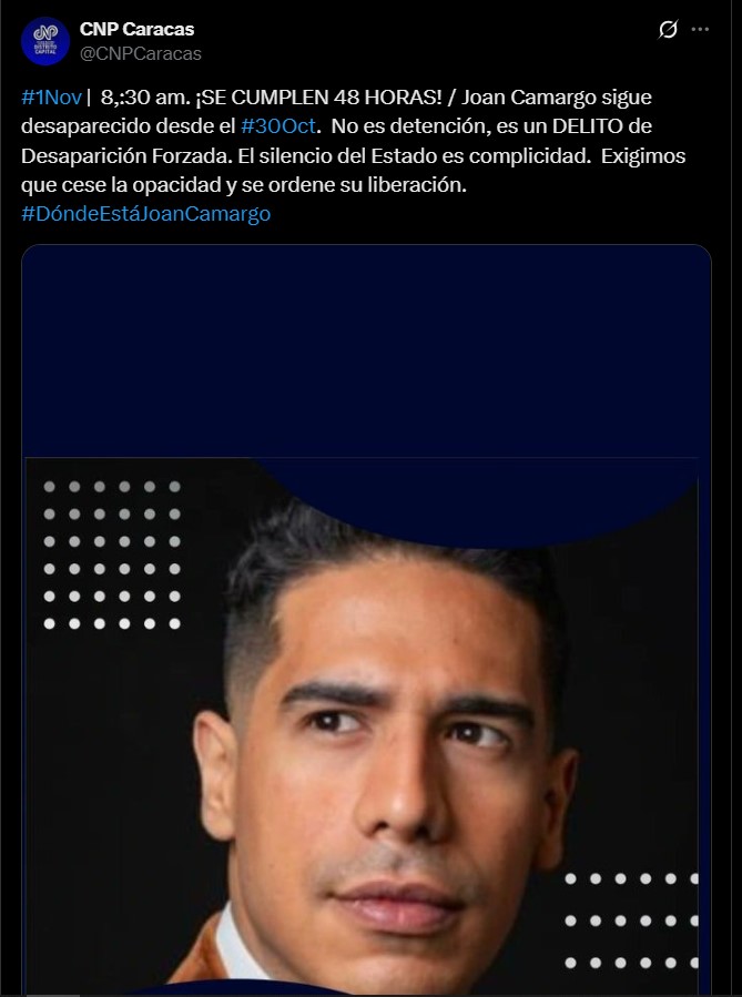 “¡Se cumplen 48 horas! El periodista de sucesos Joan Camargo sigue desaparecido desde el #30Oct. No es detención, es un delito de desaparición forzada. El silencio del Estado es complicidad. Exigimos que cese la opacidad y se ordene su liberación”, publicó el gremio a través de su cuenta en X (antes Twitter).