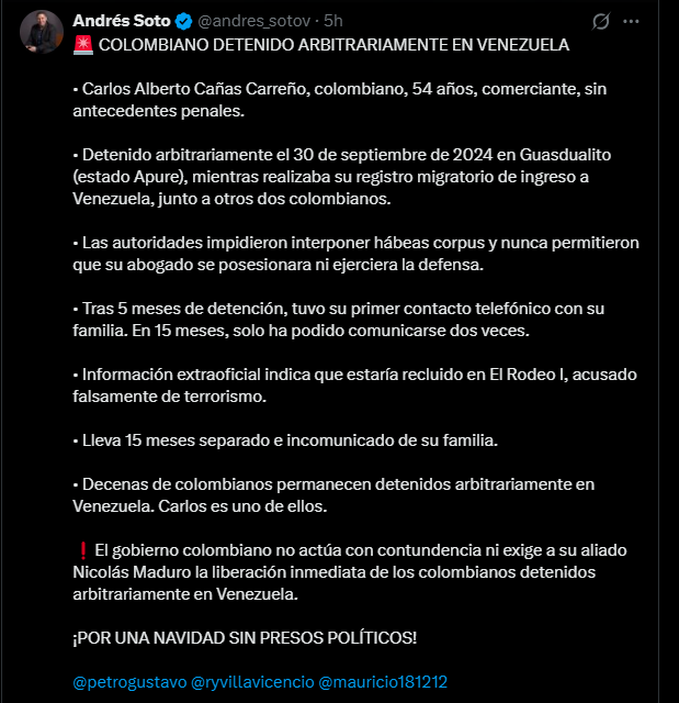 El abogado colombo-venezolano Andrés Soto, especialista en derecho público y migratorio, denunció a través de su cuenta oficial de X el caso de Carlos Alberto Cañas Carreño, un comerciante colombiano de 54 años, detenido de manera arbitraria en Venezuela desde el 30 de septiembre de 2024.