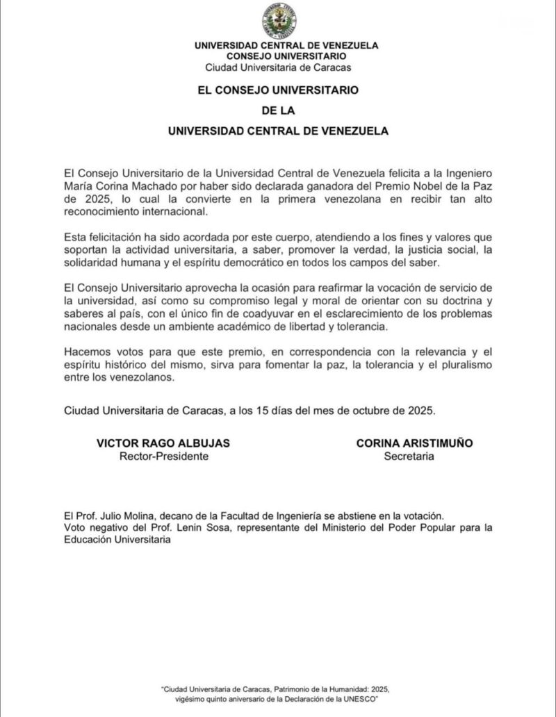 El Consejo Universitario de la Universidad Central de Venezuela (UCV) felicitó a la líder opositora María Corina Machado por haber sido declarada ganadora del Premio Nobel de la Paz 2025, convirtiéndose en la primera venezolana en recibir este reconocimiento internacional.