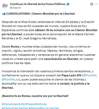 El Comité por la Libertad de los Presos Políticos anunció que su «Ruta de Fe y Esperanza» continuará este sábado 18 de octubre con un «Clamor Mundial por la Libertad».