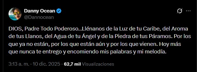 En un mensaje publicado este miércoles 10 de diciembre en su cuenta de X, el cantautor venezolano expresó una emotiva oración: