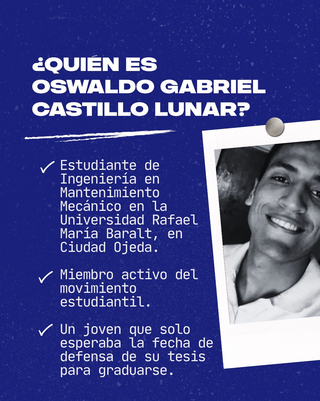 Oswaldo Gabriel Castillo Lunar, de 32 años, fue detenido arbitrariamente siendo estudiante del décimo semestre de Ingeniería en Mantenimiento Mecánico en la Universidad Nacional Experimental Rafael María Baralt (Unermb), en Ciudad Ojeda, estado Zulia.