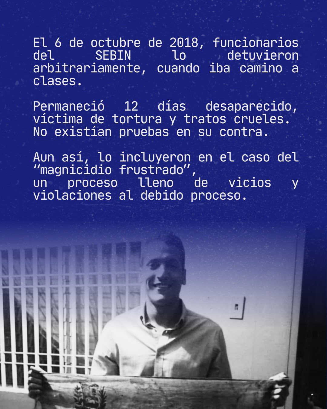 En julio de 2017, solo esperaba la fecha para defender su tesis de grado y soñaba con un futuro como ingeniero contribuyendo al desarrollo de su país. Sin embargo, denunció Clippve, el 6 de octubre de 2018 –hace exactamente siete años–, funcionarios del Servicio Bolivariano de Inteligencia Nacional (Sebin) lo detuvieron de manera arbitraria mientras se dirigía a clases.
