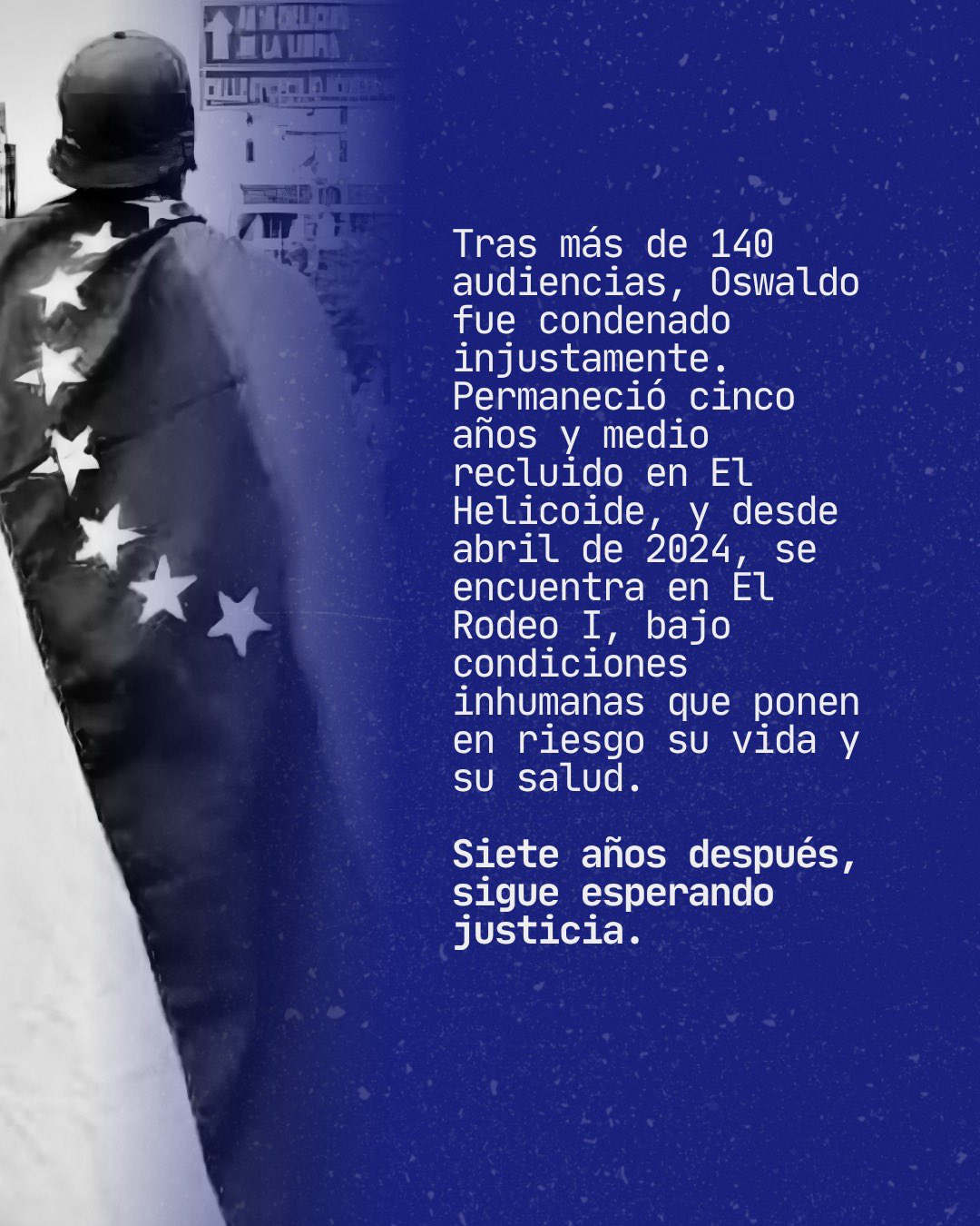 Hoy, Oswaldo permanece recluido en condiciones inhumanas en la cárcel de El Rodeo I, donde enfrenta riesgos para su salud y vida. Tras más de 140 audiencias, su familia –liderada por su madre, Yaceira Lunar– ha agotado todos los recursos judiciales sin éxito.