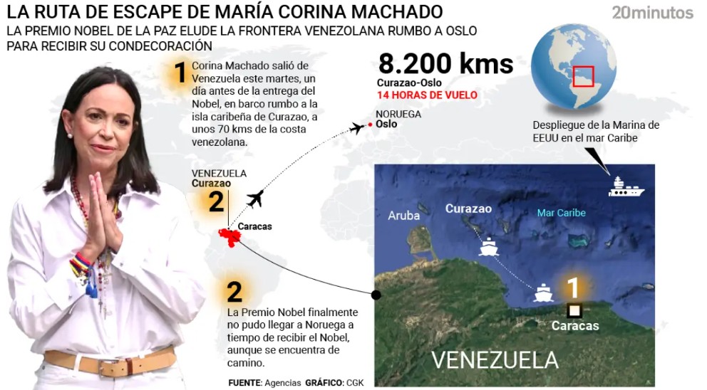 El viaje a Oslo de la opositora venezolana y premio Nobel de la Paz, María Corina Machado, fue una odisea que comenzó con la salida de su país por vía marítima hacia Curazao, según hipótesis de analistas, y se completó con un largo viaje en avión de casi 9.000 kilómetros a la capital noruega, con escala en Estados Unidos.