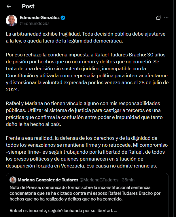 El presidente electo de Venezuela, Edmundo González, condenó la tarde del miércoles 3 de diciembre de 2025 la sentencia de 30 años de cárcel impuesta a su yerno Rafael Tudares Bracho, calificándola como un acto de “arbitrariedad”, “represalia política” y una decisión “incompatible con la Constitución” de la República Bolivariana de Venezuela.