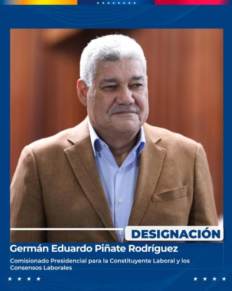 Delcy Rodríguez oficializó el nombramiento de Germán Eduardo Piñate Rodríguez como Comisionado Presidencial para la Constituyente Laboral y los Consensos Laborales.