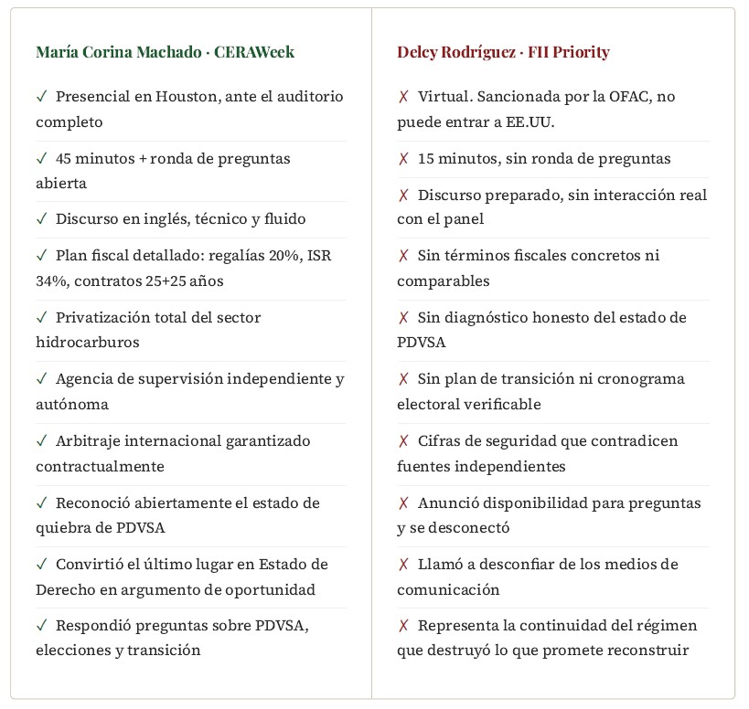 A veces la historia tiene buen sentido del tiempo. En menos de 24 horas, y sin que nadie lo hubiera planeado así, el mundo de las inversiones energéticas pudo ver cara a cara las dos propuestas de Venezuela: la de una lideresa en Houston, presente en el escenario, respondiendo preguntas en inglés ante las empresas más poderosas del sector; y la de una funcionaria en Miami que apareció en pantalla durante 15 minutos, leyó sus cifras, anunció que estaba «a la disposición para las preguntas» y se desconectó.