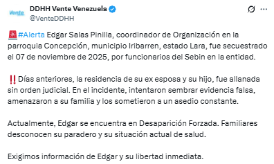 Vente Venezuela denunció el secuestro y la desaparición forzada de Edgar Salas Pinilla, coordinador de Organización en la parroquia Concepción del municipio Iribarren, estado Lara.