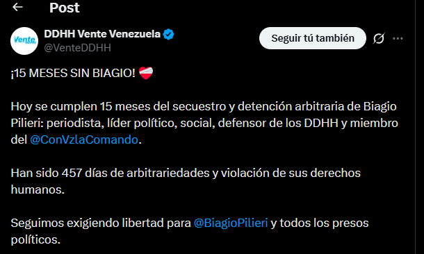 «Hoy se cumplen 15 meses del secuestro y detención arbitraria de Biagio Pilieri: periodista, líder político, social, defensor de los DDHH», señala parte del comunicado difundido desde X, donde además se recalca su rol como coordinador político dentro del comando de campaña de la alianza opositora Comando Con Vzla y su trayectoria como comunicador social en Venezuela.