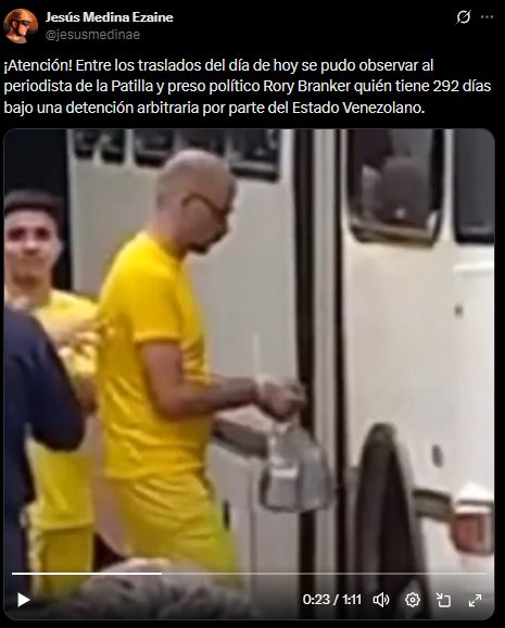 Un material audiovisual difundido por el fotoperiodista Jesús Medina en X confirmó que el comunicador Rory Branker fue sacado de su centro de reclusión por las autoridades, aunque su destino final sigue siendo incierto para sus abogados y parientes.