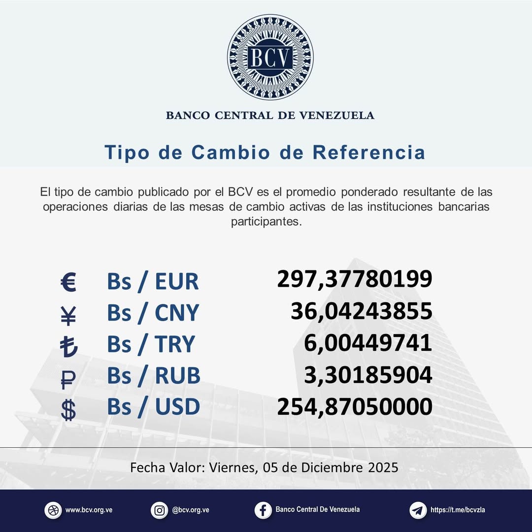 Según la cotización publicada por el organismo, el dólar se ubicará en 254,87 bolívares, lo que representa un aumento de 2,99?Bs (1,19?%) respecto al cierre del jueves 4 de diciembre.