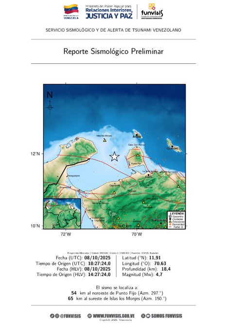 Dos sismos de magnitudes 4.7 y 4.0 se registraron en el occidente de Venezuela durante la tarde de este miércoles 8 de octubre, con epicentros en los estados Falcón y Zulia, respectivamente. Los temblores, confirmados por la Fundación Venezolana de Investigaciones Sismológicas (Funvisis), ocurrieron con apenas 17 minutos de diferencia.