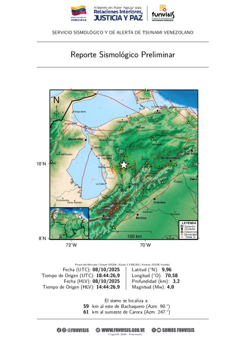 Poco después, a las 2:44 p.m., se registró el segundo temblor, de magnitud 4.0. Este evento tuvo un epicentro 59 kilómetros al este de Bachaquero, en el estado Zulia, y fue considerablemente más superficial, con solo 3.2 kilómetros de profundidad, lo que puede intensificar la percepción del movimiento en zonas cercanas.