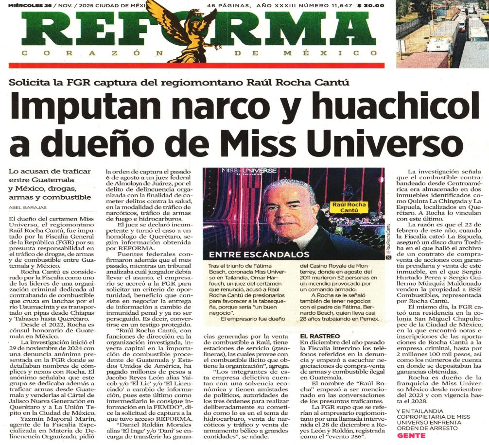 El dueño del certamen Miss Universo, el regiomontano Raúl Rocha Cantú, fue imputado por la Fiscalía General de la República (FGR) por su presunta responsabilidad en el tráfico de drogas, de armas y de combustible entre Guatemala y México.