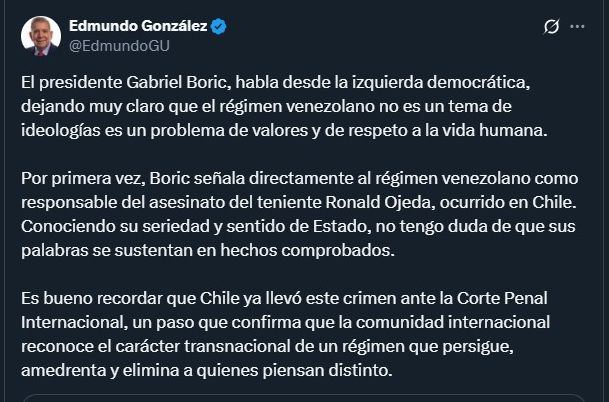 “El presidente Gabriel Boric, habla desde la izquierda democrática, dejando muy claro que el régimen venezolano no es un tema de ideologías, es un problema de valores y de respeto a la vida humana”, dijo González Urrutia a través de su cuenta en X.