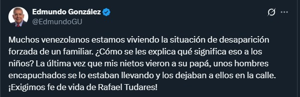 “La última vez que mis nietos vieron a su papá, unos hombres encapuchados se lo estaban llevando y los dejaban en la calle. ¡Exigimos fe de vida de Rafael Tudares!”, dijo el dirigente político a través de su cuenta personal en X, en respuesta a una publicación de su hija, Mariana González.