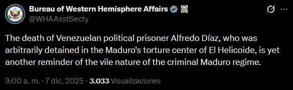 «La muerte del preso político venezolano Alfredo Díaz, detenido arbitrariamente en el centro de tortura de Maduro, El Helicoide, es otro recordatorio de la naturaleza vil del régimen criminal de Maduro», expresó la cuenta oficial del despacho del diplomático Michael Kozak.