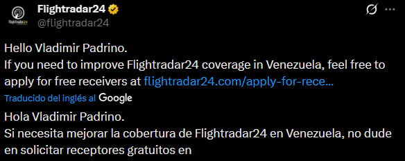 «Hola, Vladimir Padrino. Si necesita mejorar la cobertura de Flightradar24 en Venezuela, no dude en solicitar receptores gratuitos», bromeó la firma civil en una publicación de X.