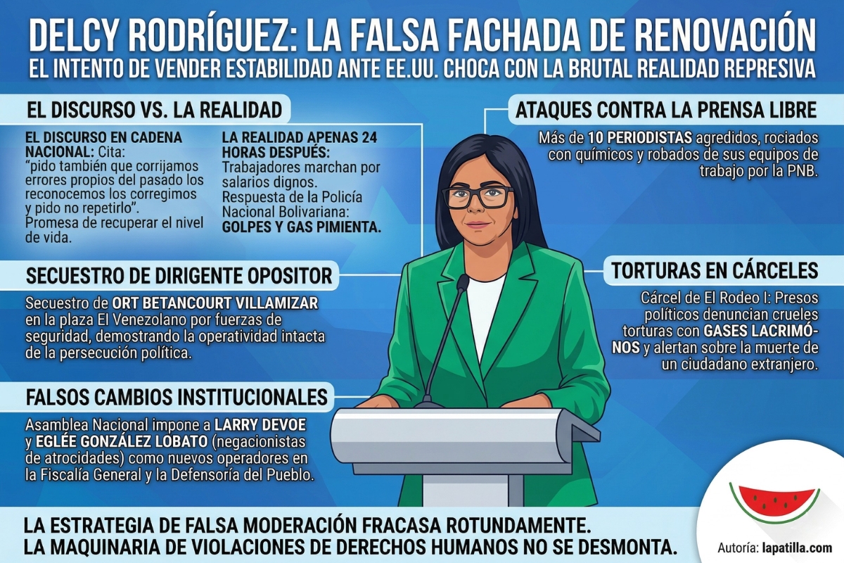 Apenas 24 horas después de que la sucesora de Maduro pronunciara en cadena nacional la frase «pido también que corrijamos errores propios del pasado los reconocemos los corregimos y pido no repetirlo», el aparato represivo del Estado atacó con furia a los trabajadores que marchaban en el centro de la capital para exigir salarios dignos. Rodríguez intentó ocultar la miseria al prometer la recuperación del nivel de vida de la población, pero la respuesta real del oficialismo en las calles se tradujo en golpes y gas pimienta por parte de la Policía Nacional Bolivariana.