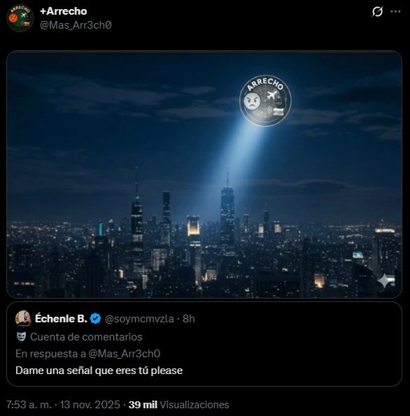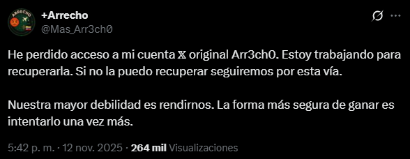 «He perdido acceso a mi cuenta X original Arr3ch0. Estoy trabajando para recuperarla. Si no la puedo recuperar seguiremos por esta vía. Nuestra mayor debilidad es rendirnos. La forma más segura de ganar es intentarlo una vez más», anunció el divulgador desde su nuevo usuario @Mas_Arr3ch0.